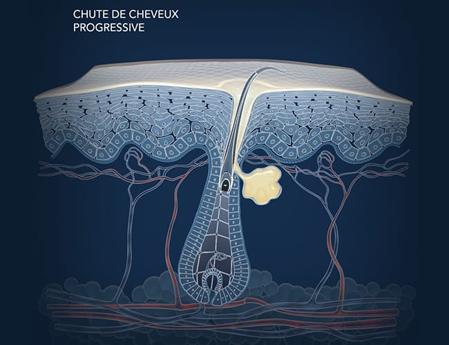 La chute de cheveux progressive est entraînée par le dysfonctionnement de 3 voies biologiques qui interagissent entre elles.